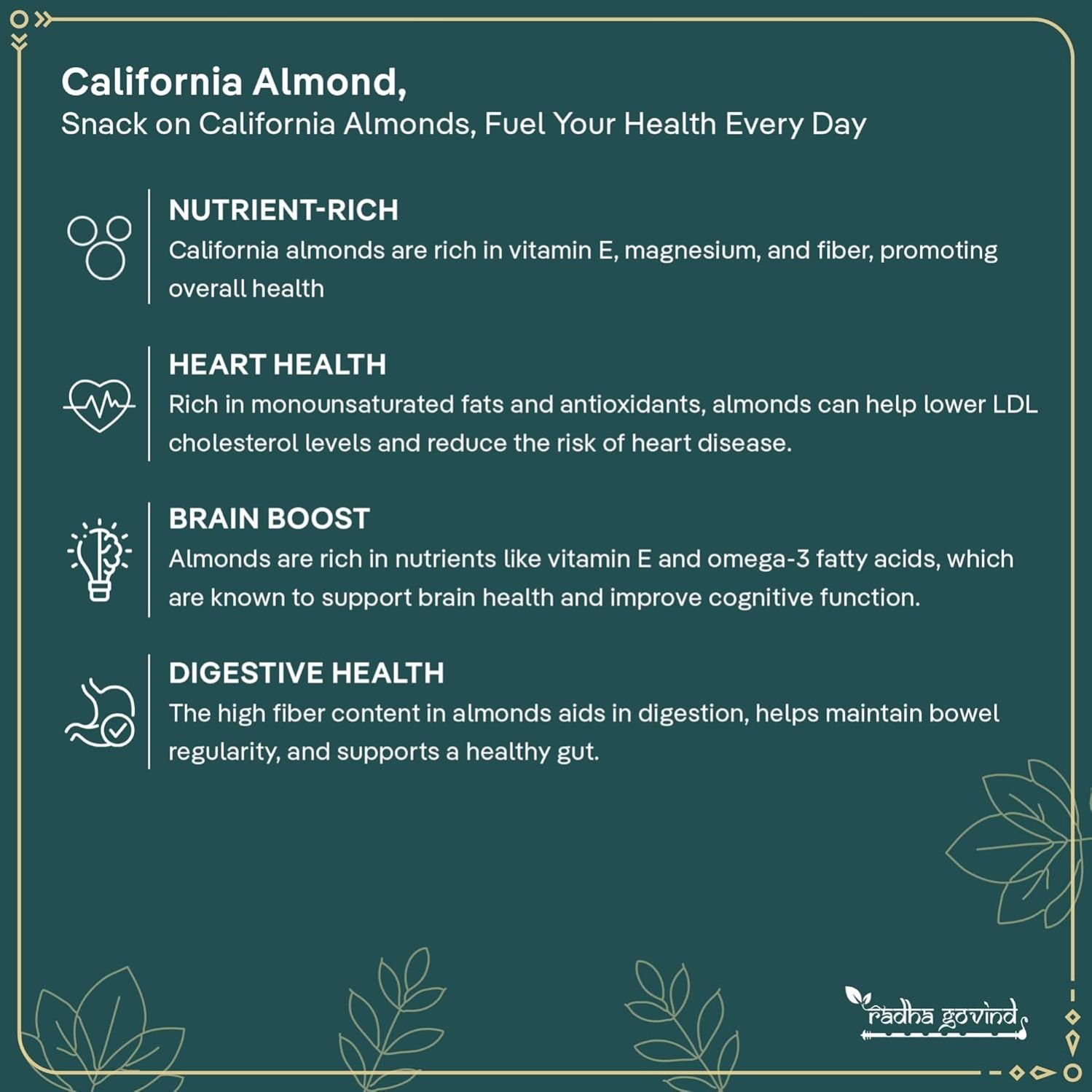 Enjoy top-quality almonds sourced from the finest California farms with Radha Govind 100% Pure California Almonds. Known for their crunchy texture, rich taste, and high nutritional value, these almonds make a perfect addition to a healthy lifestyle.